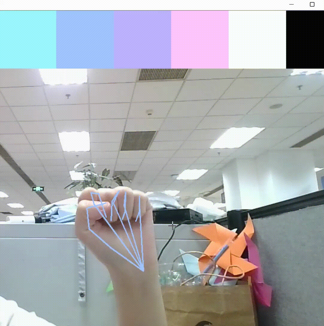 本案例将使用YOLOX、SCNet两个模型,实现一个简单的隔空作画趣味应用,使用🖐手势作画,使用🤟手势取食指处色块换色,使用✊手势清屏。最终效果如下所示: