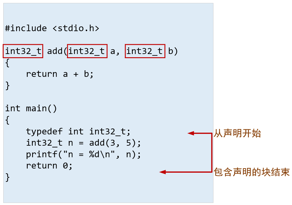 别名如果定义在代码块中,那么它就具有块作用域。别名的作用域从别名声明开始,直到包含声明的代码块结束。