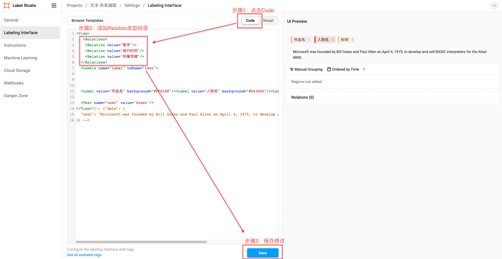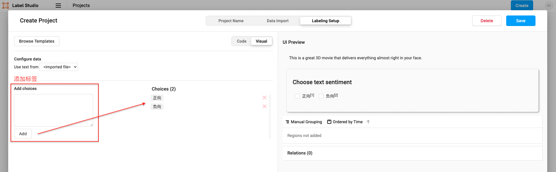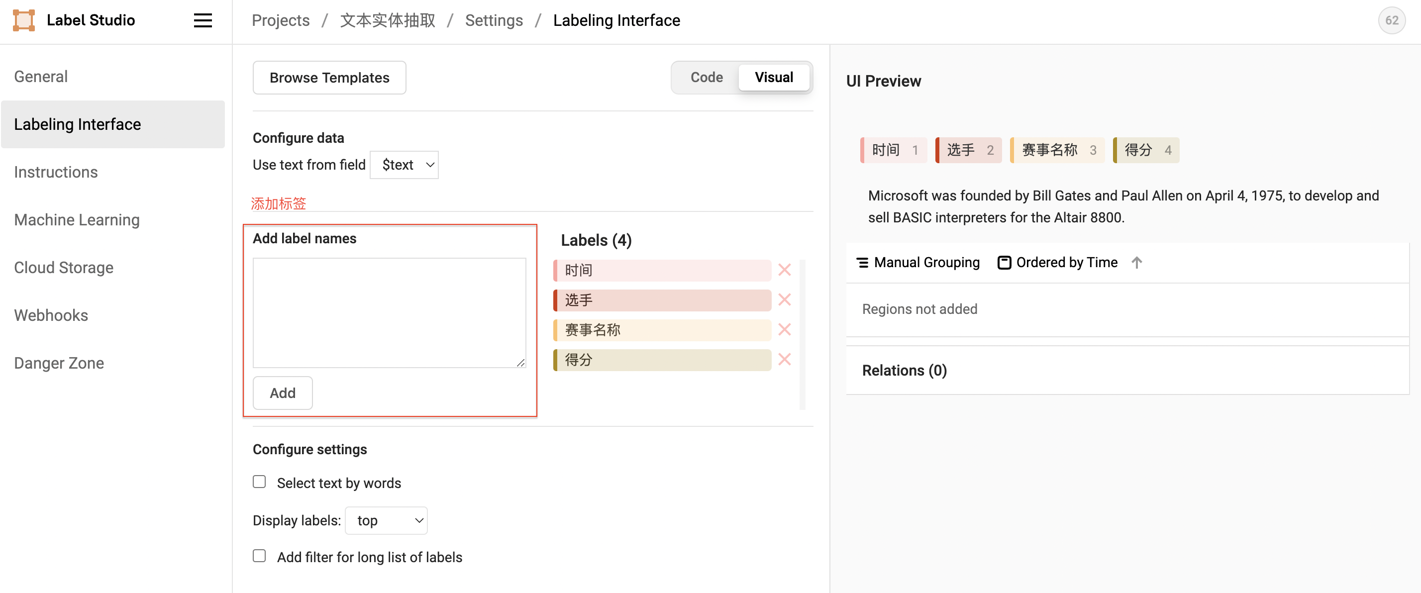 添加标签(也可跳过后续在Setting/Labeling Interface中配置)