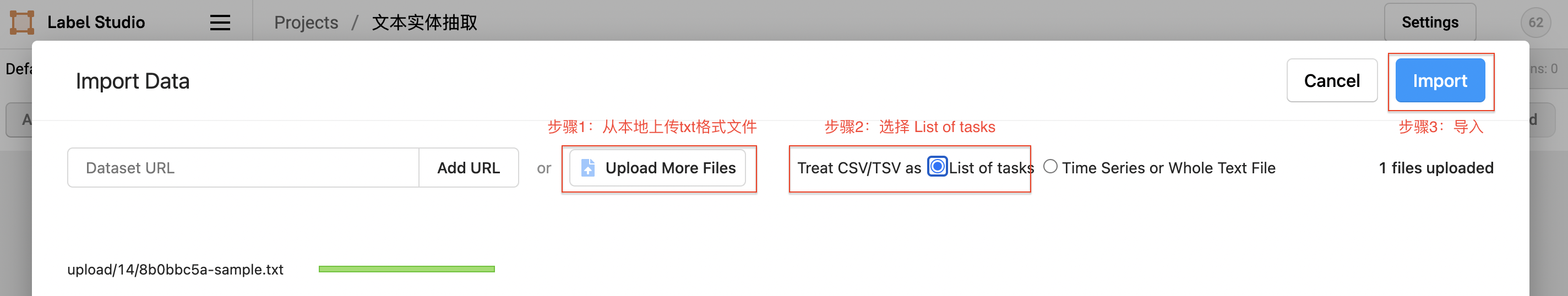 先从本地上传txt格式文件,选择List of tasks,然后选择导入本项目。