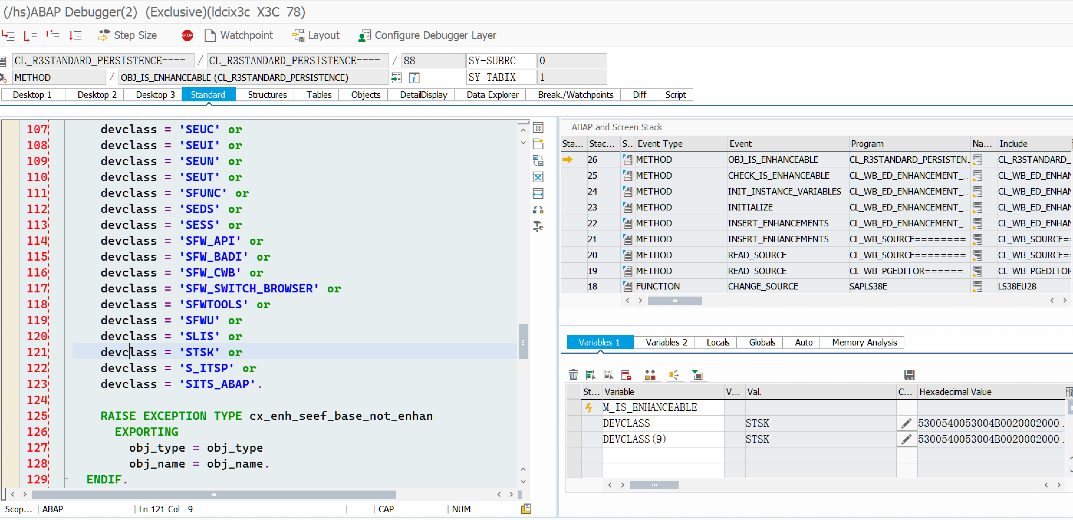 在 cl_r3standard_persistence 的 obj_is_enhanceable 方法里,有些 ABAP 系统核心的 Software Component 被硬编码成不可修改,以避免 ABAP 开发人员低质量的增强影响整个系统的运行,如下图所示: