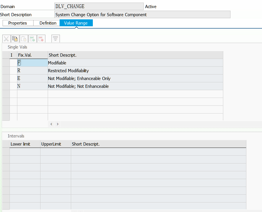 一个 ABAP Software Component 的可编辑性有下列 4 种情况,通过 Domain DLV_CHANGE 控制: