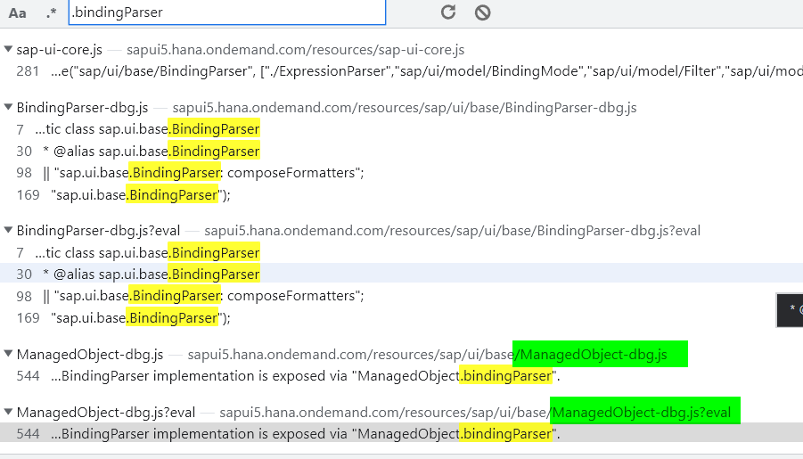 看我在 Chrome 开发者工具里搜索 SAP UI5 的 bindingParser 实现,能看到 XXX-dbg.js 和 XXX-dbg?eval 总是成对出现: