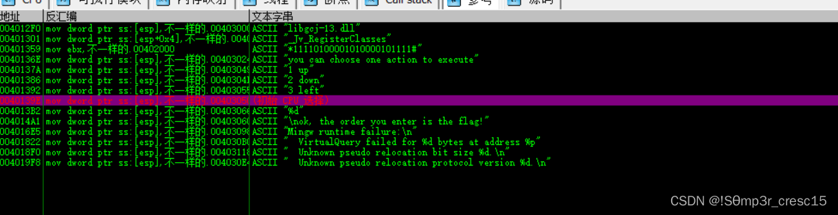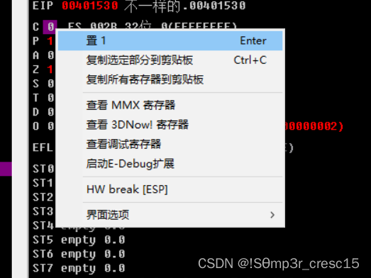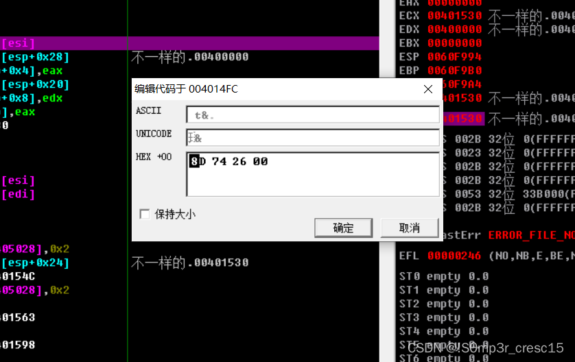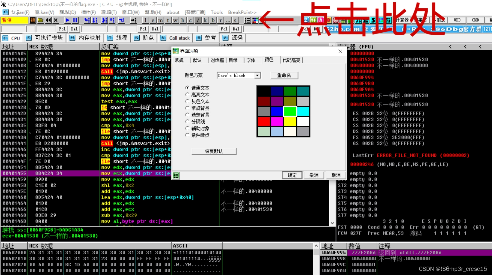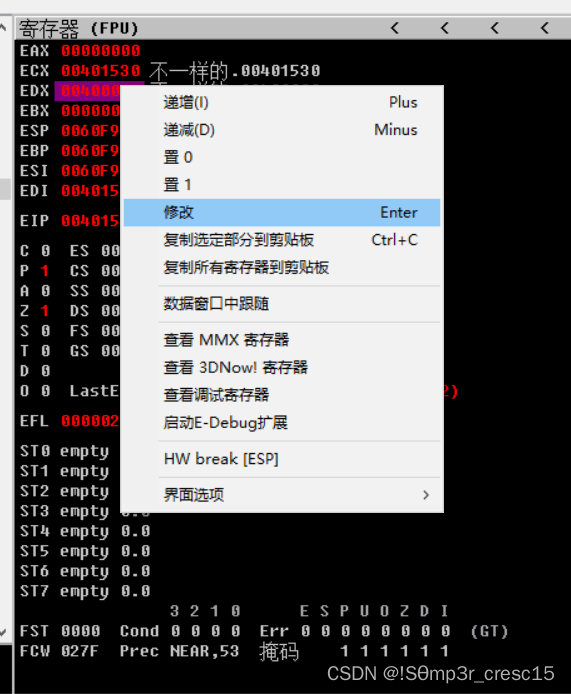 1.光标可以点在任何一行汇编代码,双击EIP寄存器的值,可以回到当前动态调试执行的代码的地址,EIP寄存器的值是不能直接修改的