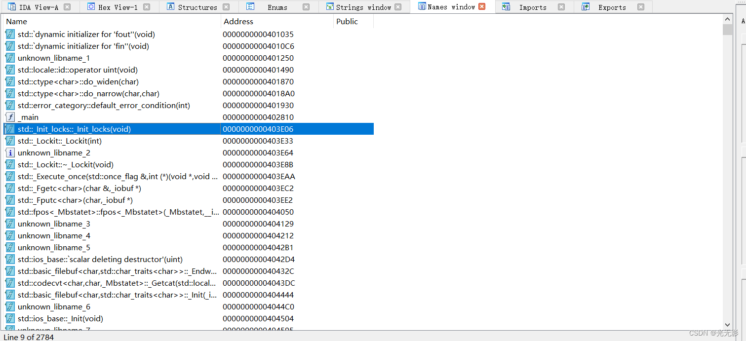 从中可以查找程序中使用的字符串(有时也可以用Hex view查勘字符串,但是一般在string窗口中检索想要的关键字符串)