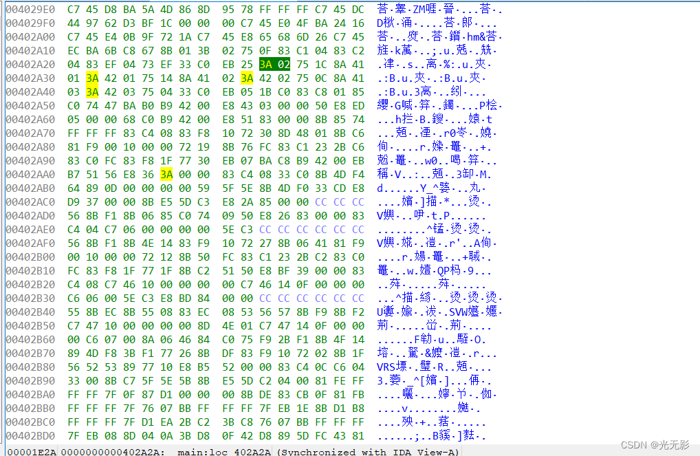 还会显示对应的ASCII字符(!!!所以有时string窗口显示的字符串不好查看时,可以打开Hex view查看)