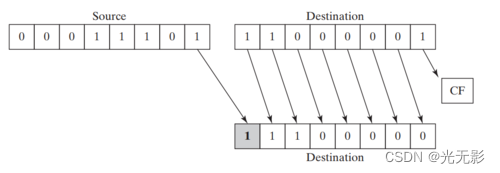 源操作数最低位移动到目的操作数空出来的最高位,目的操作数最低位移动到CF,其余位右移