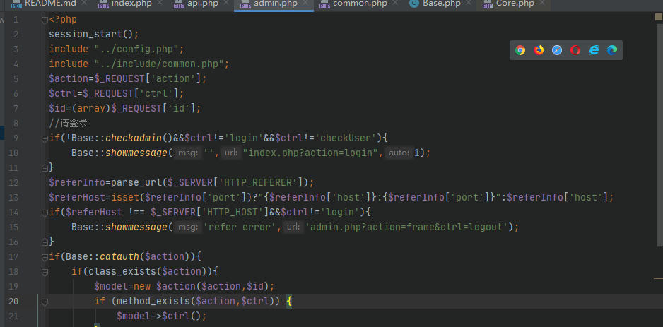 后台路由代码 admin.php 文件与前台路由代码基本类似,只是在上面添加了session校验,检测是否为
