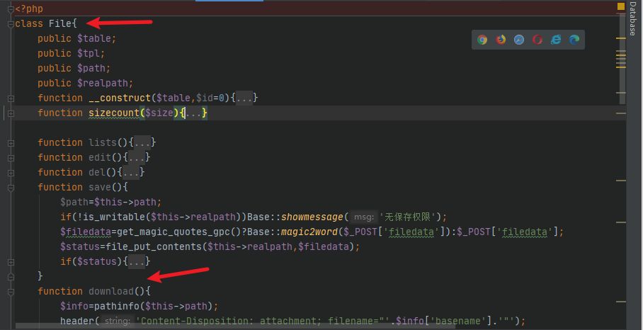 file.php 文件也就是File这个类下存在一个 download() 方法,我们把一些用不到的类先折叠起来方便