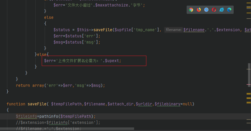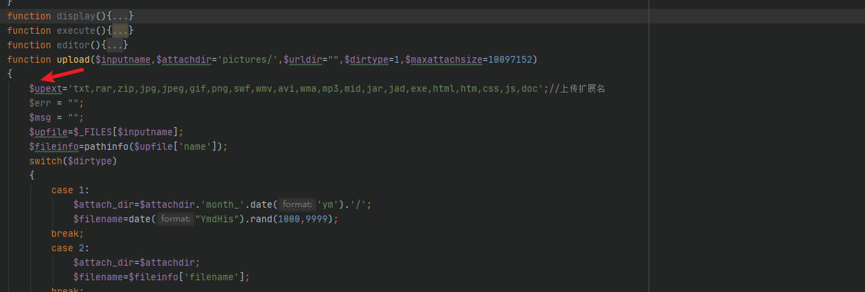 在该方法的最上面定义了 $upext 变量,这里包含了可以上传的后缀名,也就是白名单,大致看了这些