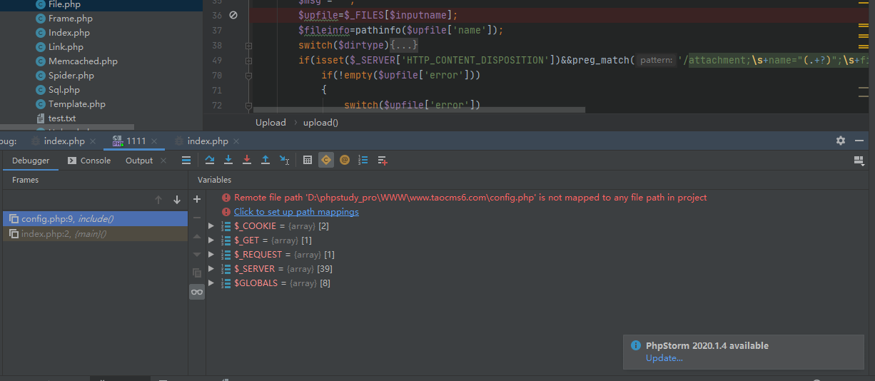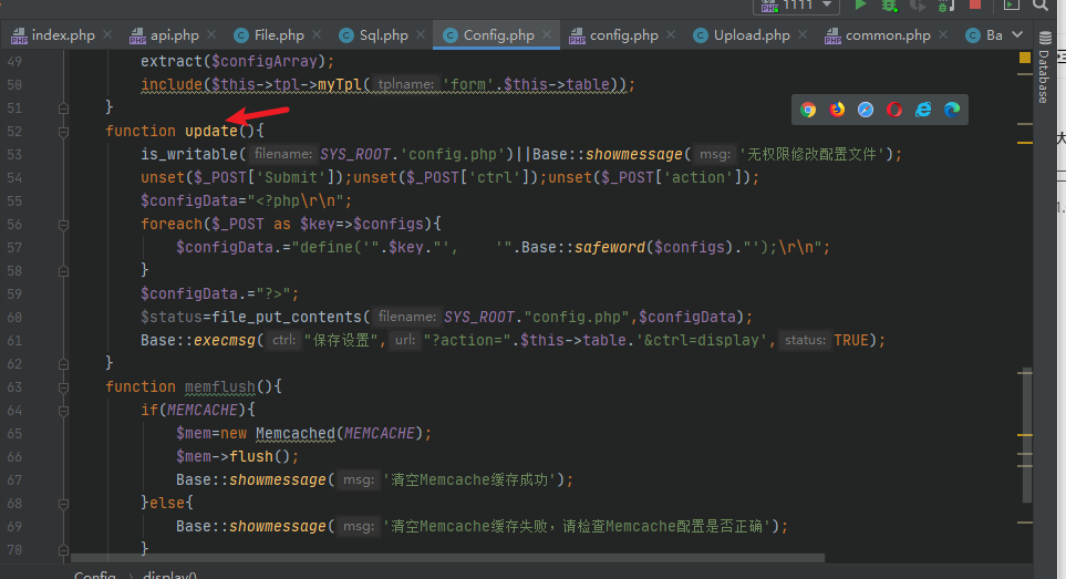 首先我们去查看代码该功能点代码,这里调用 upload() 方法,第53行直接判断config.php是否可写,