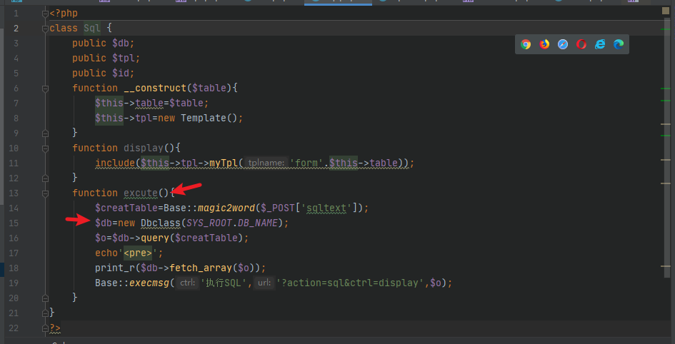 在Sql类下的 excute() 方法,依旧的简洁明了。通过14行传入 $sqltext 参数也就是我们的SQL语句,