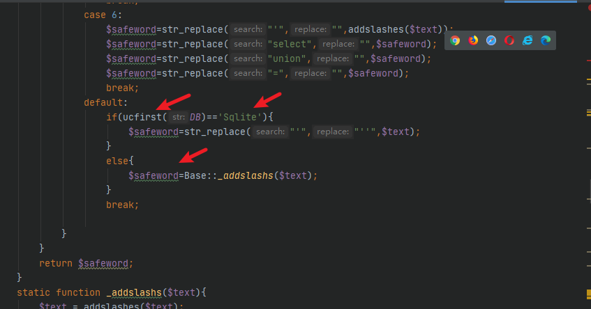 为 Sqlite 是的话执行Sqlite的过滤代码,如果不是则走158行的else,,调用 Base::_addslashs() 方