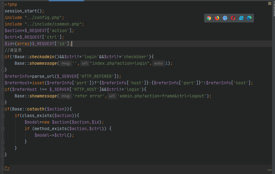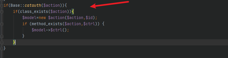 先会调用Base类中的catauth方法对$action参数进行判断,之后会判断是否存在相应的类,如果存在的话就实例化该类并赋值给$model,并且会判断$ctrl方法是否存在于$action类中,存在的话就会调用类中无参方法