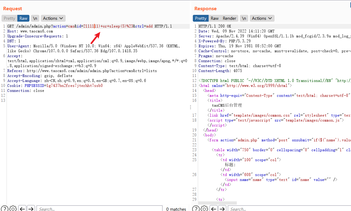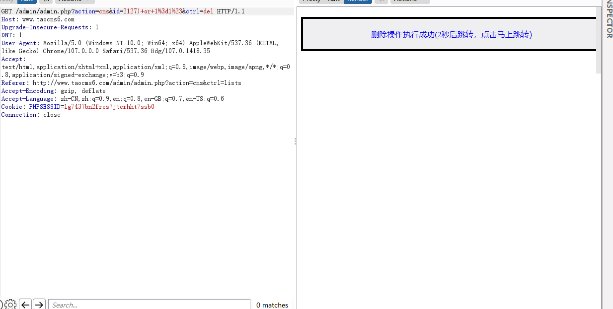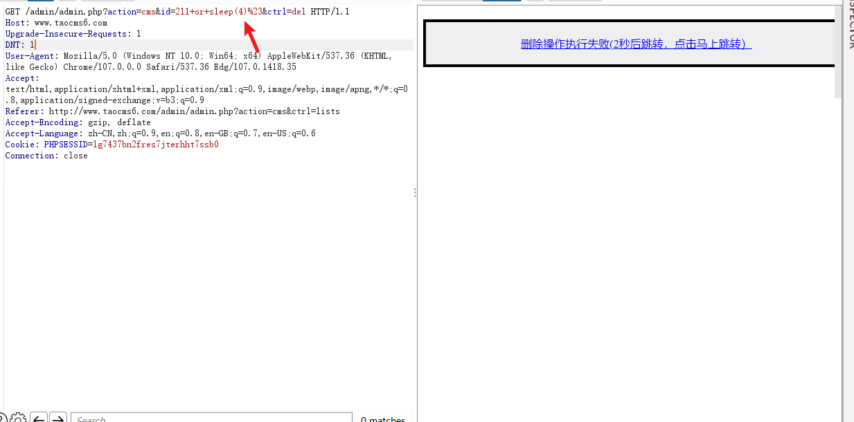 那么直接抓包修改id值,注意不能用or,我用or这个payload打的时候没触发sleep()函数,因为or是代表或的意思,而这里id=2,2是存在的,所以就不执行sleep函数,就像命令中的“||”符号。所以用and直接一起执行。