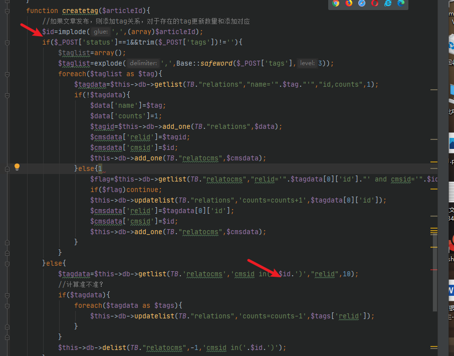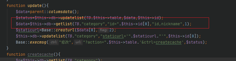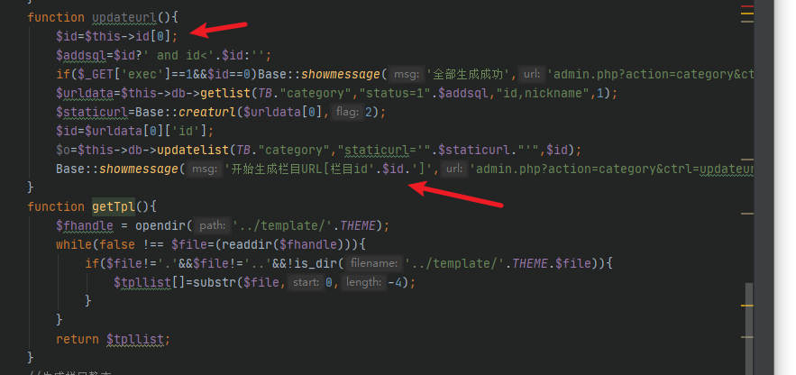 筛选到cms类中的updateurl方法存在该函数调用,分析前后发现$addsql参数是由$id参数组合而成的,那么也很明显的存在注入,id没有经过处理。