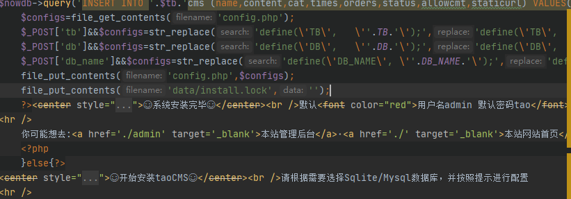 可以看到这里先调用file_get_contents读取了配置文件当中的内容,接着调用了str_replace将默认值替换成了POST中传入的参数值,这里其实三个参数都能够写入shell文件,这里对db_name进行写入shell;除此之外这里还会在data文件夹下生成install.lock锁文件,作为是否安装过的判断条件