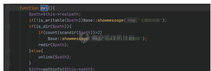 这里会对指定绝对路径要删除的文件的全选进行判断,并且如果是文件夹的话会遍历文件夹并判断文件夹是否为空,之后就会直接进行删除的操作,加上目录穿越就可以进行任意文件删除了。