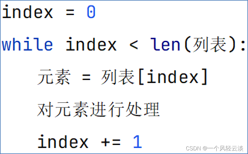 定义一个变量表示下标,从0开始 循环条件为 下标值 < 列表的元素数量