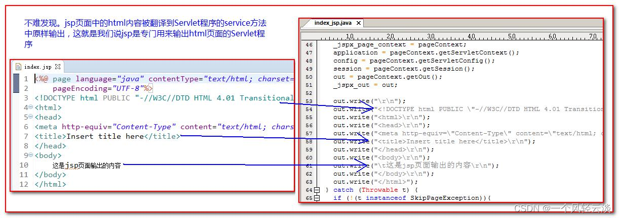 xxx_jsp.java 文件是一个 Servlet 程序。原来 jsp 中的 html 内容都被翻译到 Servlet 类的 service 方法中原样输出。
