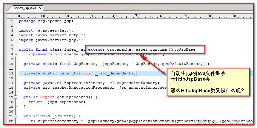 生成的 java 文件名,是以原来的文件名加上_jsp 得到。 xxxx_jsp.java 文件的名字 我们打开 index_jsp.java 文件查看里面的内容: 发现,生成的类继承于 HttpJspBase 类。这是一个 jsp 文件生成 Servlet 程序要继承的基类!!!