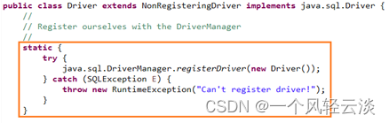 通常不用显式调用 DriverManager 类的 registerDriver() 方法来注册驱动程序类的实例,因为 Driver 接口 的驱动程序类都包含了静态代码块,在这个静态代码块中,会调用 DriverManager.registerDriver() 方法 来注册自身的一个实例。下图是MySQL的Driver实现类的源码: