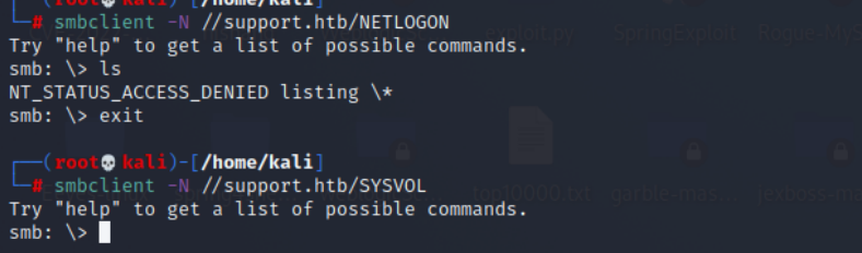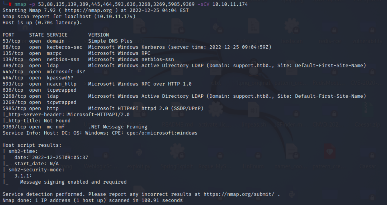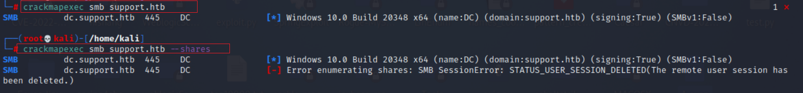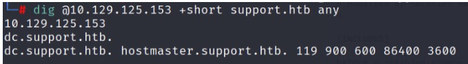 我们的 dig 命令确认服务器的计算机名称是“dc”,域名是“support.htb”。