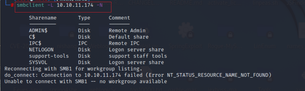 SMB 文件共享是重要的信息收集方式,然后我们去枚举SMB 文件共享。