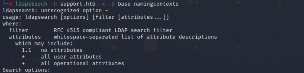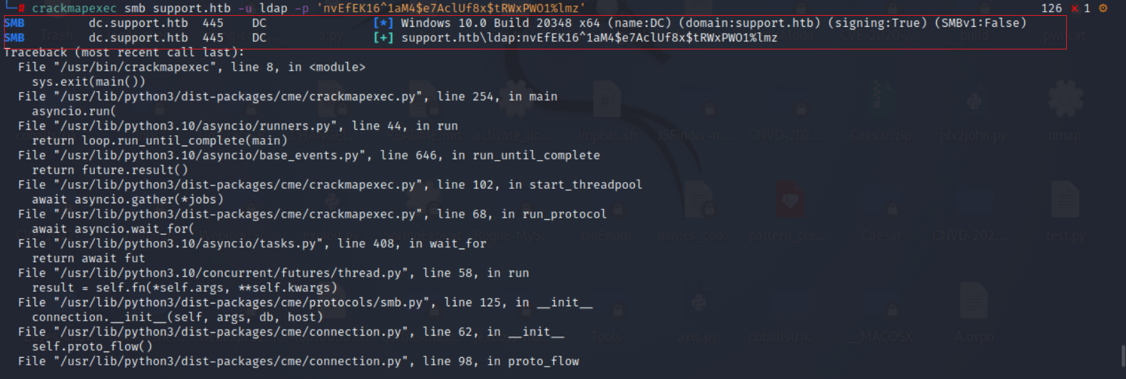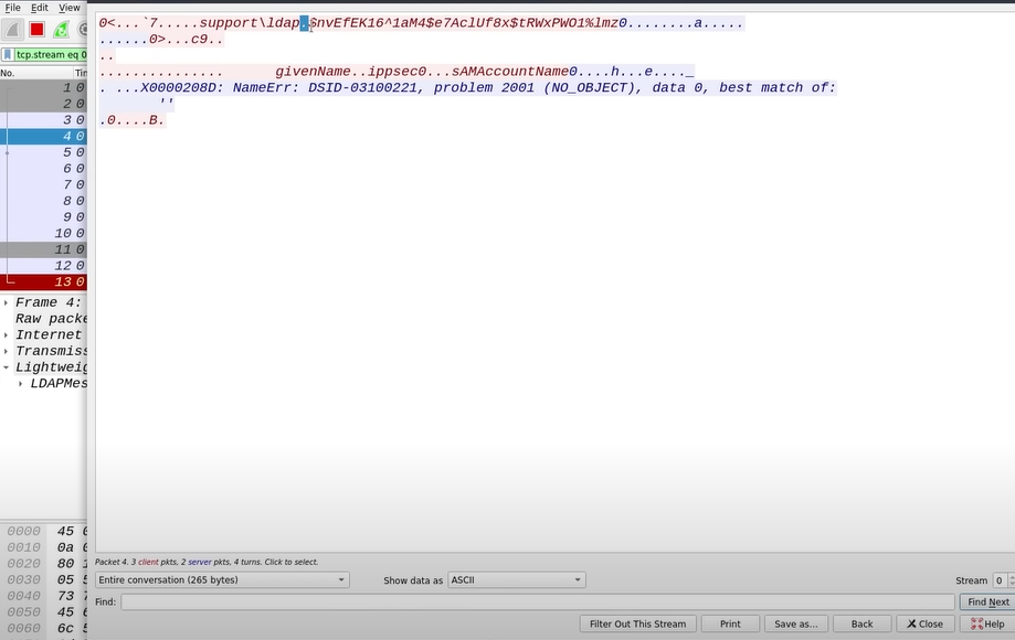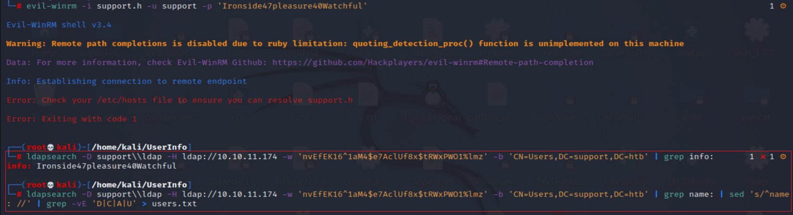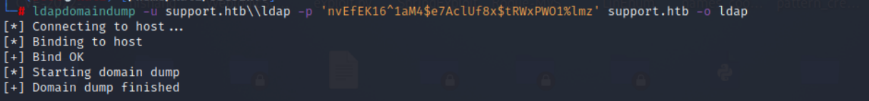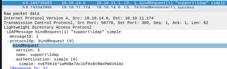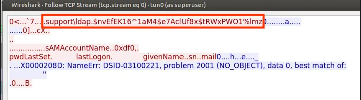 显示它正在加载密码,然后使用用户 SUPPORT\ldap 和该密码连接到 LDAP。