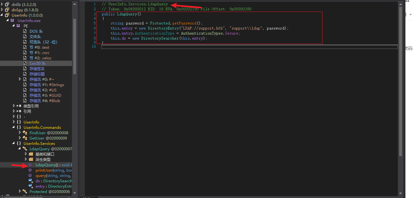 我可以进一步研究 LDAP 注入,但考虑到它正在对 Support 进行 LDAP 查询,并且我已经表明这些查询需要身份验证,我将查看二进制文件以找到凭据。