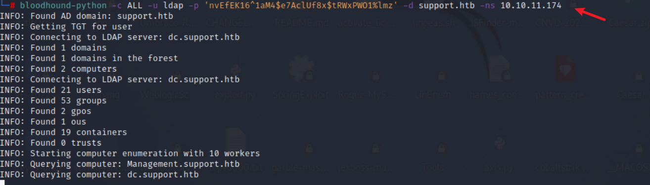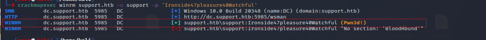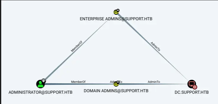 我需要知道 DC 上的管理员,Bloodhound 告诉我是 administrator@support.htb: