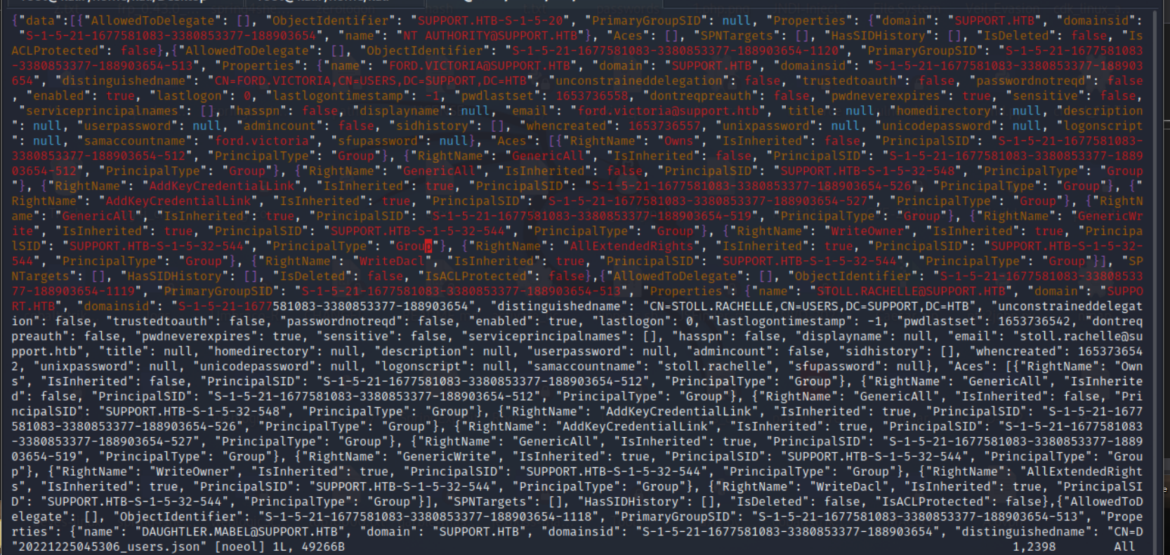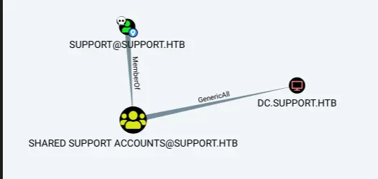 再次查看 Bloodhound 数据,支持用户是 Shared Support Accounts 组的成员,该组GenericAll在计算机对象上具有 DC.SUPPORT.HTB: