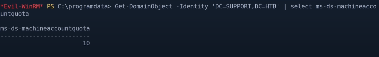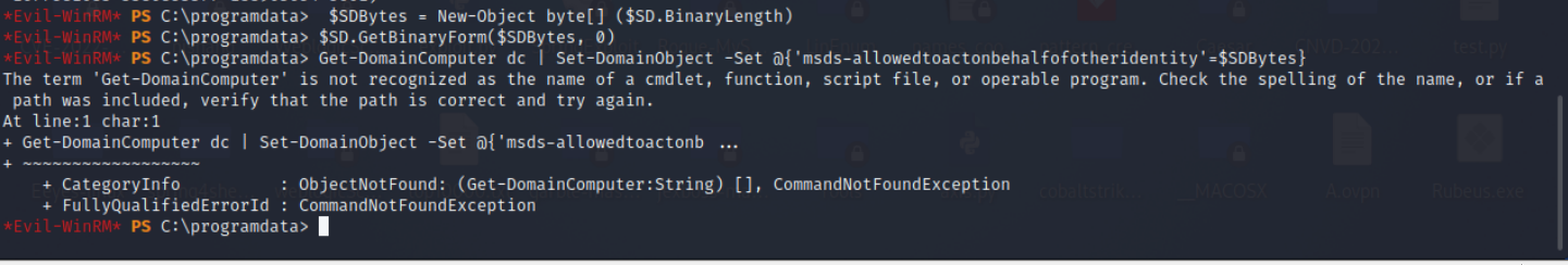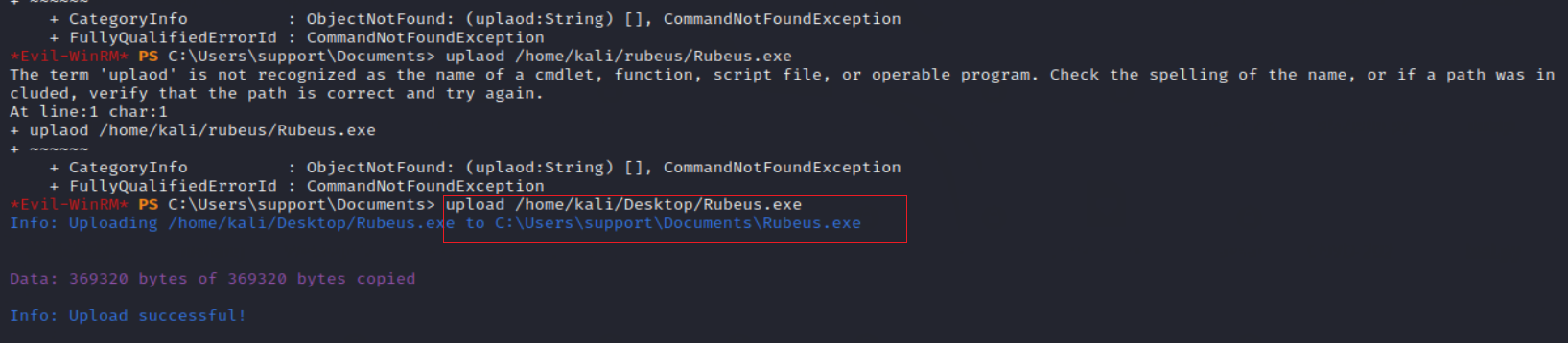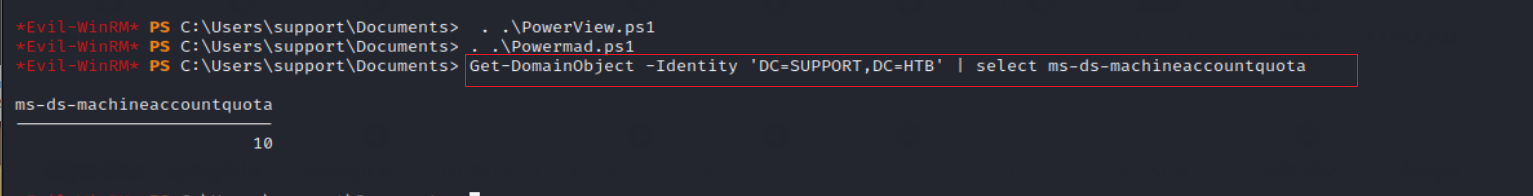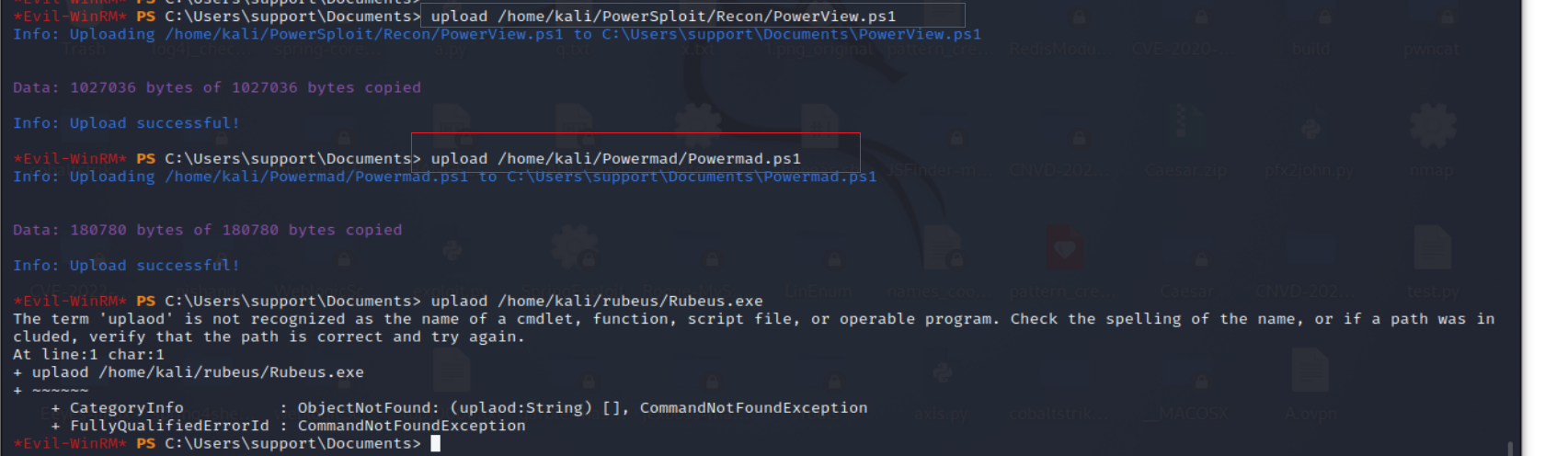 我们首先需要连接到“dc.support.htb”服务器;使用相同的 Evil-WinRM 会话连接。连接后,将我们需要的两个工具上传到服务器上,Powermad和Rubeus。上传后,我们将执行以下操作。