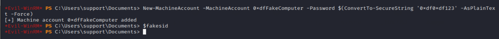 New-MachineAccount -MachineAccount (Get-Variable -Name "FakePC").Value -Password $(ConvertTo-SecureString '123456' -AsPlainText -Force) -Verbose