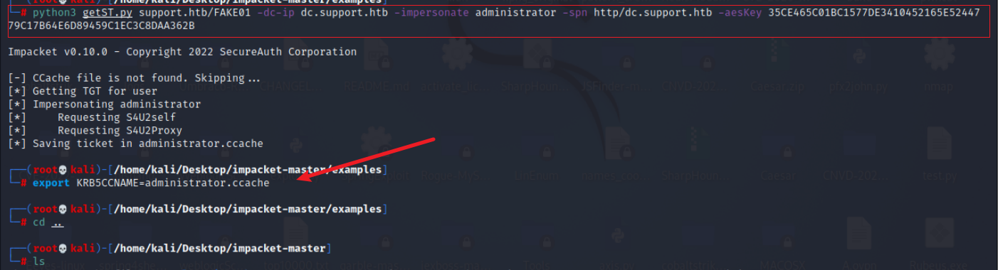 我们已经利用了这个安全漏洞,并赋予计算机对象“FAKE01”冒充另一台计算机。因此,我们向“dc.support.htb”上的资源请求一个新的 Kerberos Ticket-Granting-Ticket(TGT)。
