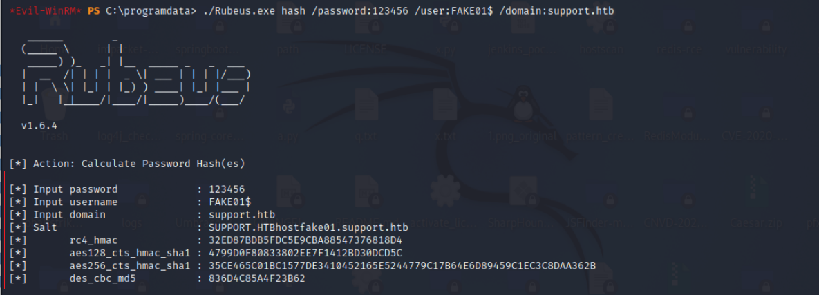 ./r.exe hash /password:123456 /user:FAKE01$ /domain:support.htb