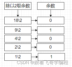 整数位计算方式: 整数位除以2 取余数直到商为0,那么按照上面计算过程得到的余数,从上到下依次对应二进制整数位的从右到左顺序的值 10010。