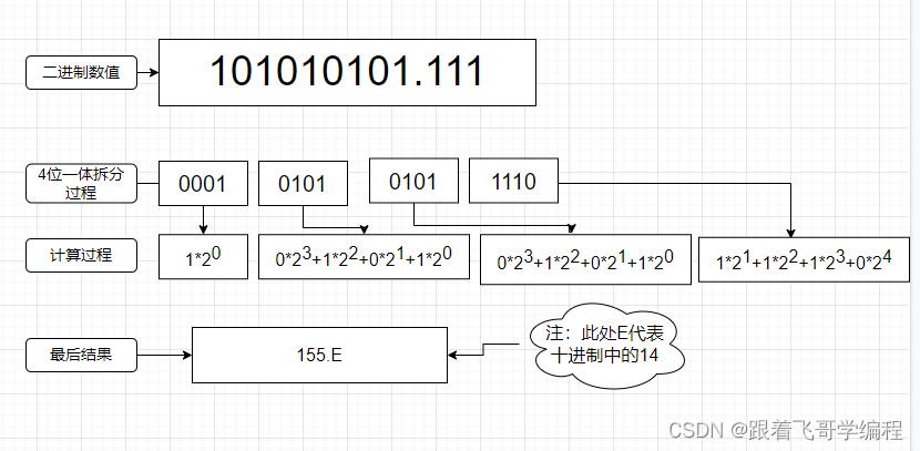 例如:二进制数,101010101.111 转换为 16进制为 155.E