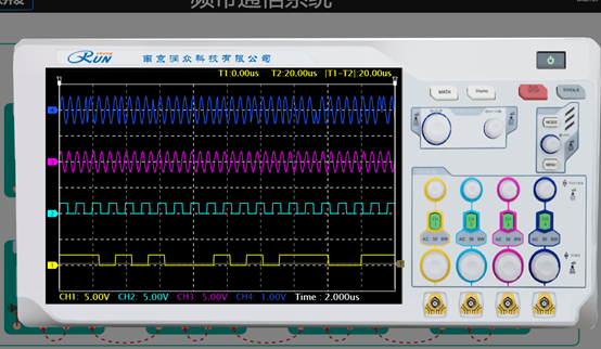 标签的对应依次是:4:调制信号、3:载波信号、2:时钟信号、1:数据。从实验结果中可以看到调制信号产生了相位突变。