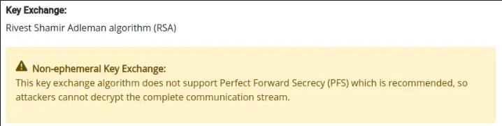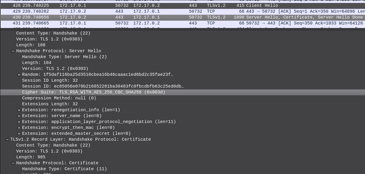 在这种情况下感兴趣的是密码套件,TLS_RSA_WITH_AES_256_CBC_SHA256. 谷歌搜索将显示多个站点报告为弱密码套件。
