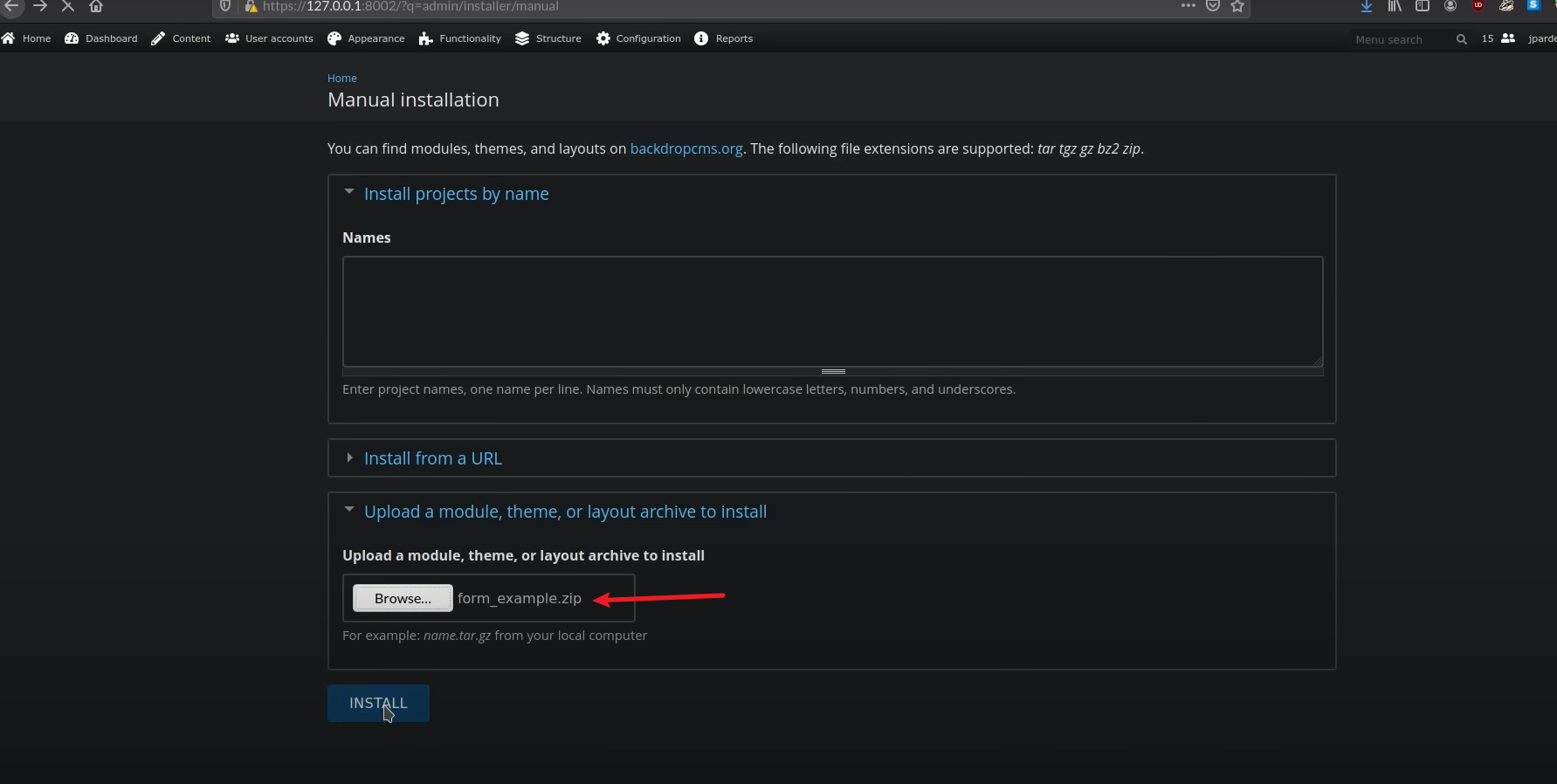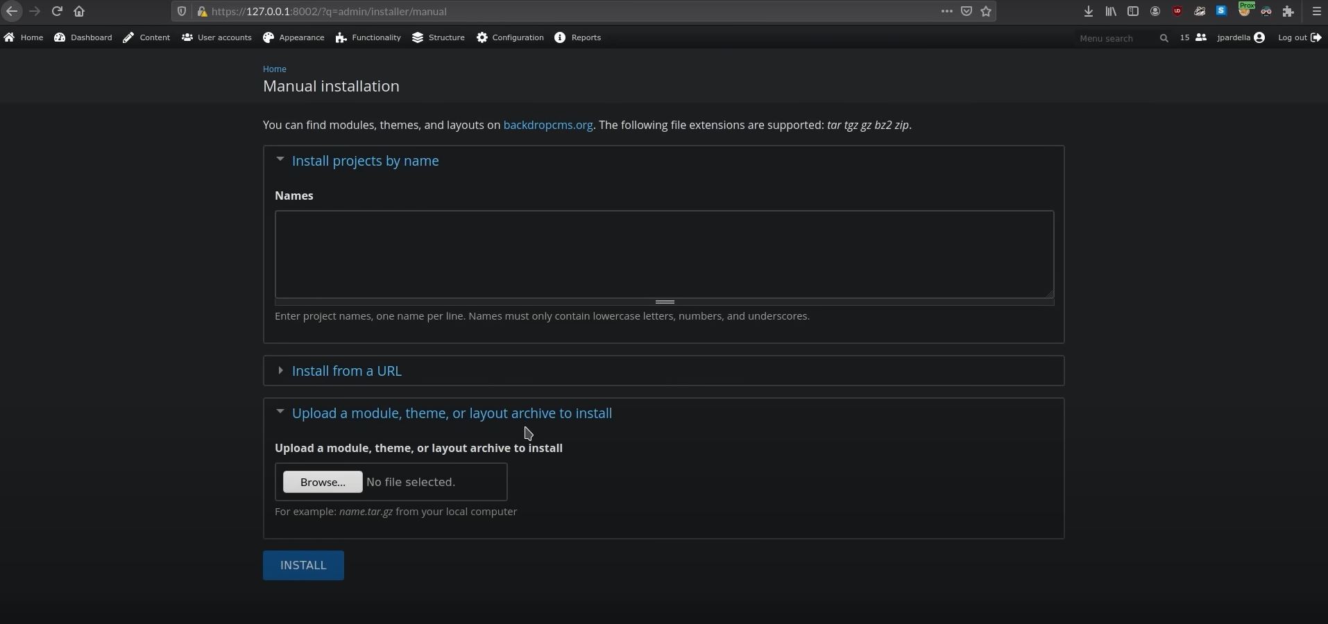 搜索 Backdrop CMS 漏洞,出现了这个 repo 。它描述了一种攻击路径,使用跨站点请求伪造 (CSRF) 让管理员安装恶意插件,从而提供 webshell。我不需要 CSRF,因为我已经可以登录管理面板了。所以我只会使用插件。