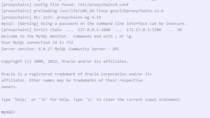 [proxychains] Strict chain ... 127.0.0.1:1080 ... 172.17.0.4:27017 ... OK