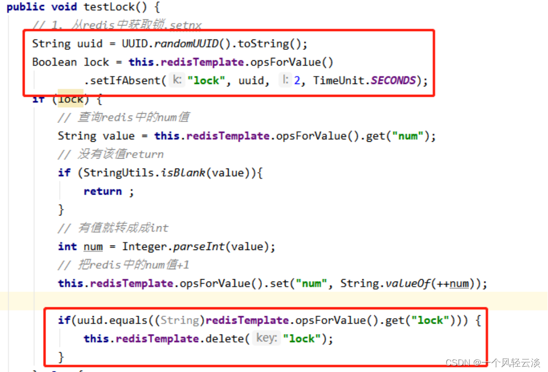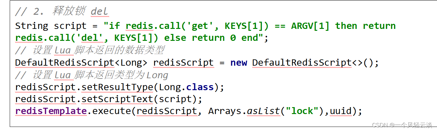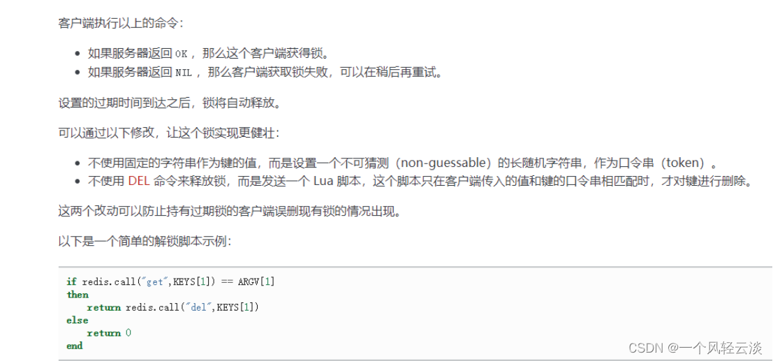 - 解铃还须系铃人。加锁和解锁必须是同一个客户端,客户端自己不能把别人加的锁给解了。