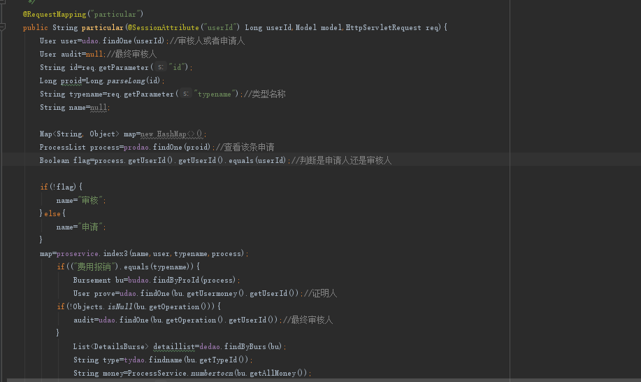 这里只放上部分关键代码,可以看到首先获取了当前用户对象,然后根据URL中的ID参数获取了流程对象,并且对比userID判断是申请人还是审批人。可以看出并没有对其他用户越权访问进行处理。