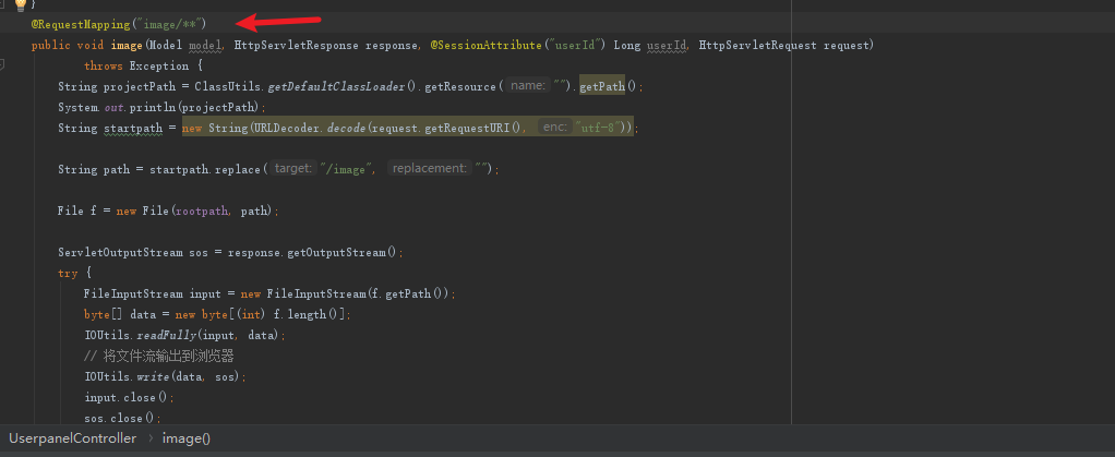 可以看到代码中首先通过getRequestURI方法当前访问的相对路径,然后将该路径中的iamge替换为空。接下来与rootpath拼接然后通过File打开文件后返回前端。