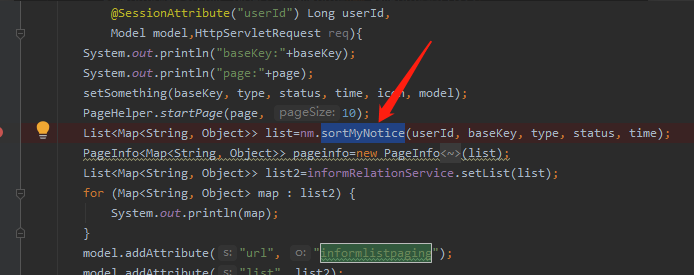 在该方法中定义了一个字符串请求参数basekey,用list集合接收了sortMyNotice方法处理basekey等参数的结果,跟进查看哪里定义了nm
